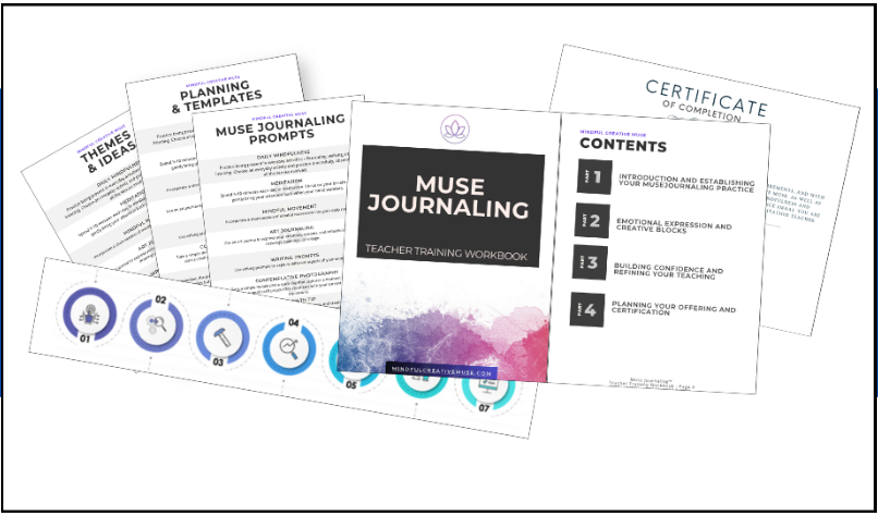 Of course, like any skill, facilitating mindful art circles, classes, or workshops need to be cultivated and strengthened with the right tools, education, and guidance. That’s where supportive training, like our internationally accredited Therapeutic Art and Muse Journaling™ Teacher Training (including our 8-step Trauma-Informed Facilitator Framework and unique, trademarked mindful art activities).